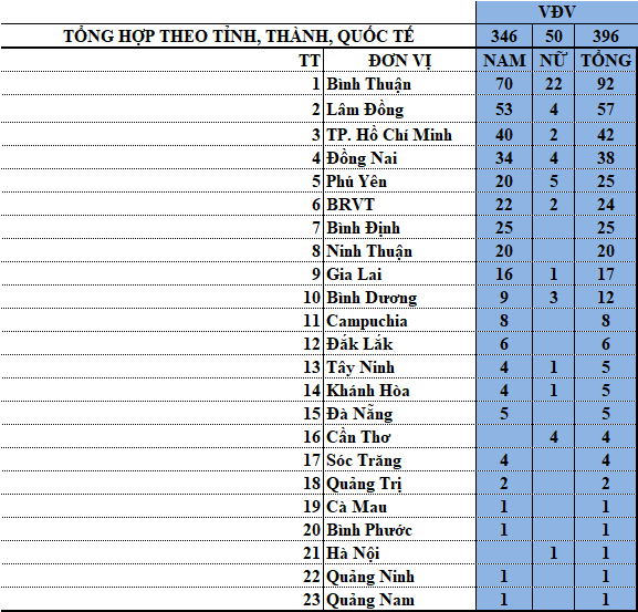 TỔNG SỐ LIỆU THI ĐẤU THEO 67 CÂU LẠC BỘ THUỘC 23 TỈNH, THÀNH, QUỐC TẾ