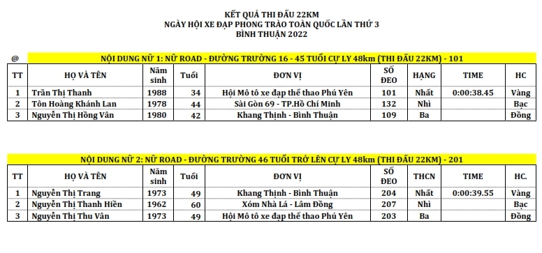 + NHÓM 1: NỮ ROAD - ĐƯỜNG TRƯỜNG 16 - 45 TUỔI CỰ LY 48km - 32 VĐV - SỐ ĐEO 101 - 132