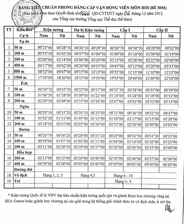 Bảng tiêu chuẩn phong cấp vận động viên môn Bơi (bể 50m)