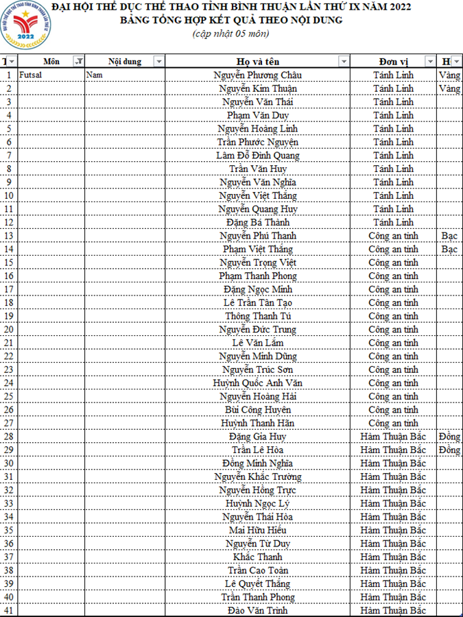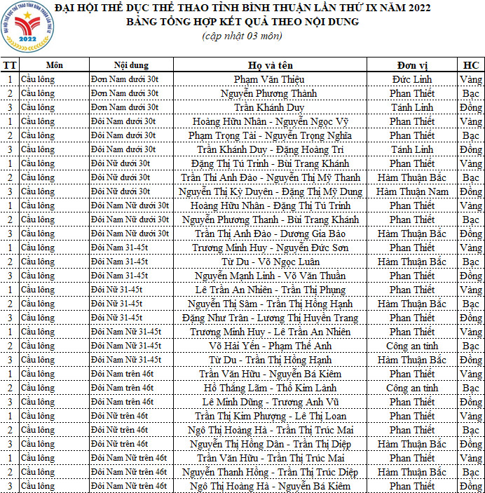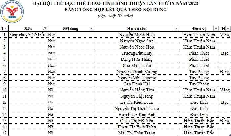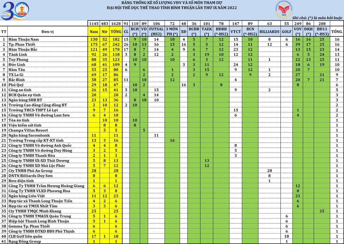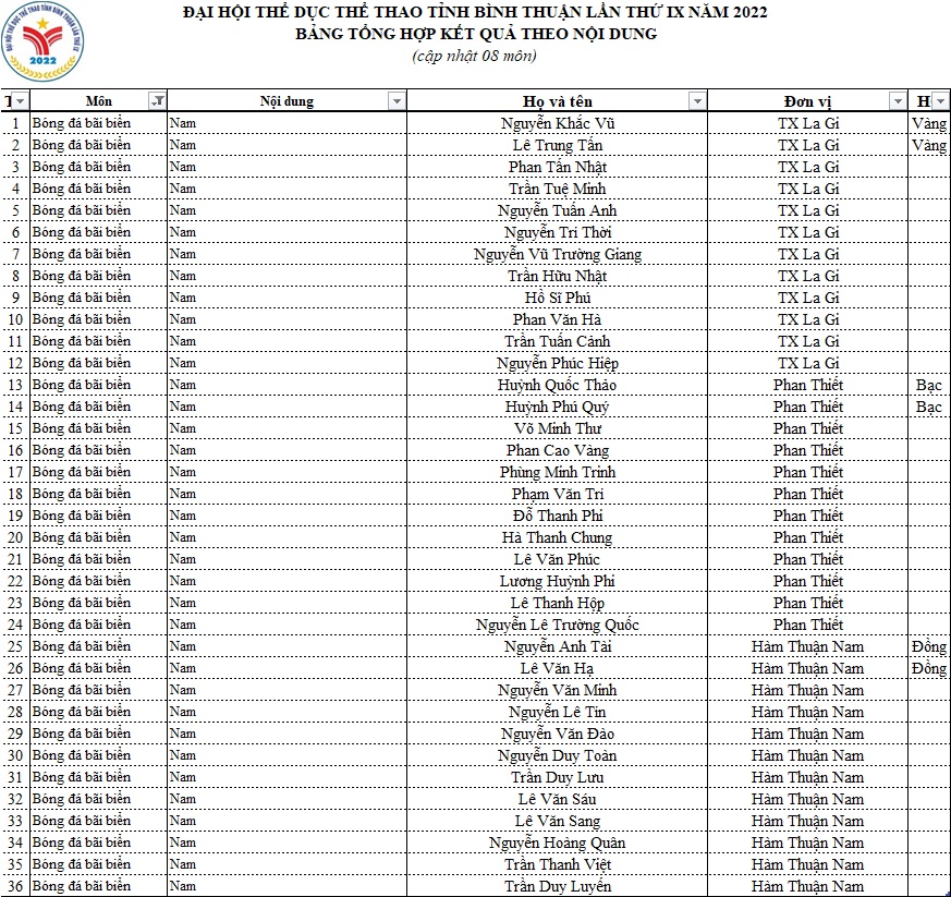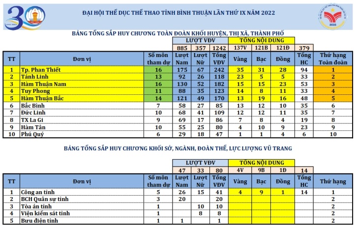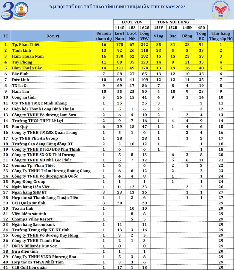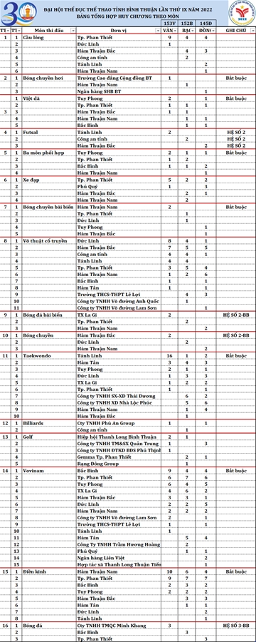 Bảng tổng sắp huy chương - nội dung các môn Đại hội TDTT tỉnh Bình Thuận lần thứ IX - 2022 cập nhật toàn bộ 16 môn: Cầu lông, Bóng chuyền hơi nữ, Việt dã, Ba môn phối hợp, Futsal, Xe đạp, Bóng chuyền bãi biển, Bóng đá bãi biển, Võ cổ truyền, Bóng chuyền nam, Taekwondo, Billiards, Golf, Vovinam, Điền kinh và Bóng đá 11 người.