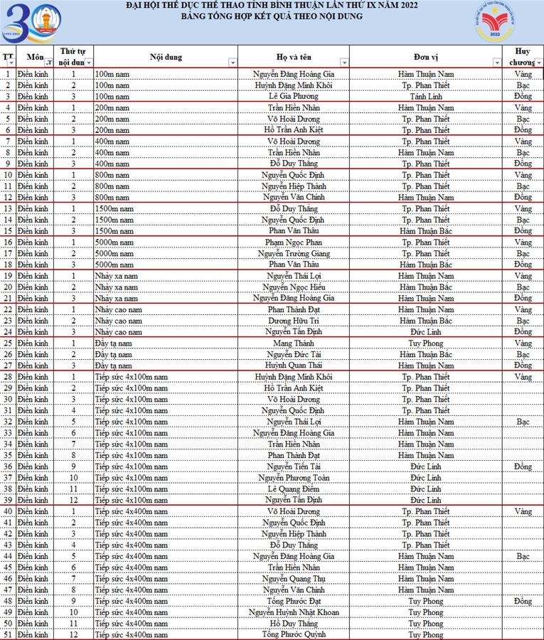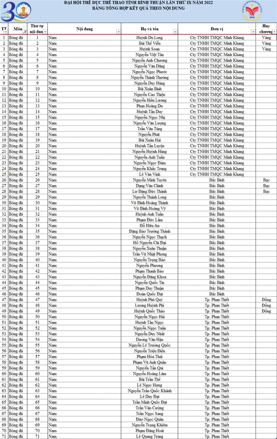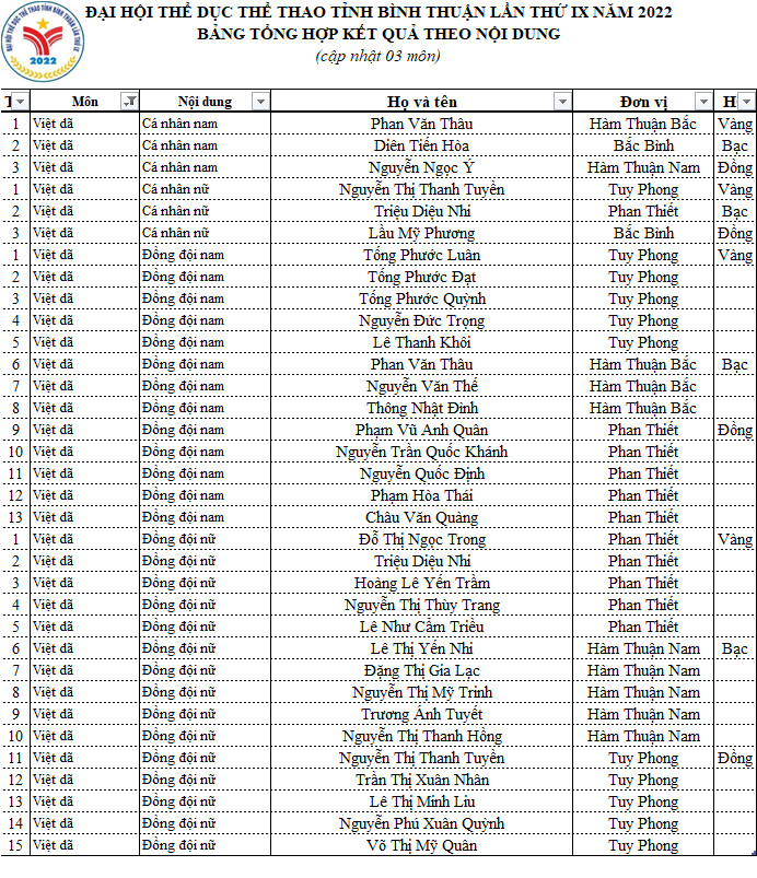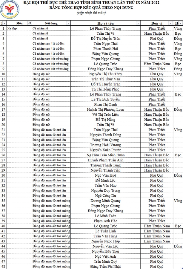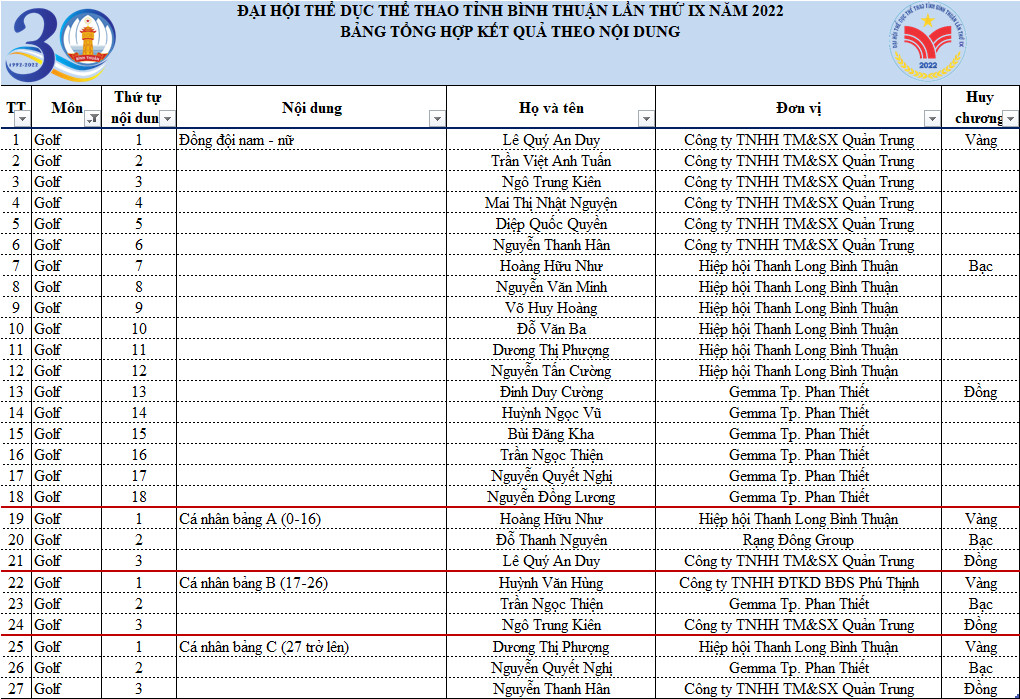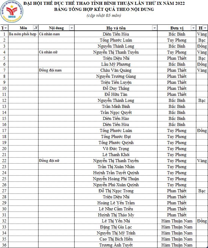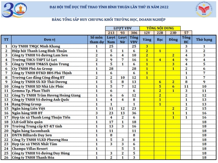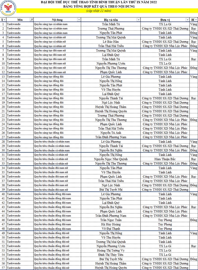 Bảng tổng sắp huy chương - nội dung các môn Đại hội TDTT tỉnh Bình Thuận lần thứ IX - 2022 cập nhật toàn bộ 16 môn: Cầu lông, Bóng chuyền hơi nữ, Việt dã, Ba môn phối hợp, Futsal, Xe đạp, Bóng chuyền bãi biển, Bóng đá bãi biển, Võ cổ truyền, Bóng chuyền nam, Taekwondo, Billiards, Golf, Vovinam, Điền kinh và Bóng đá 11 người.
