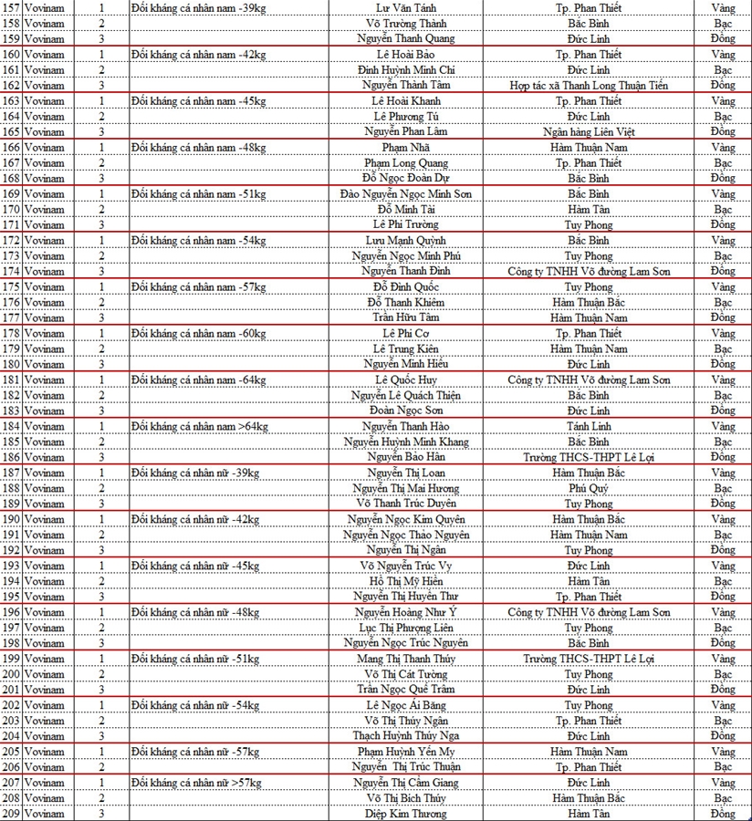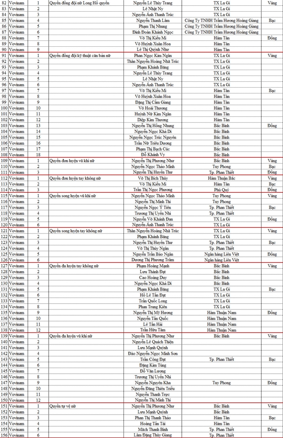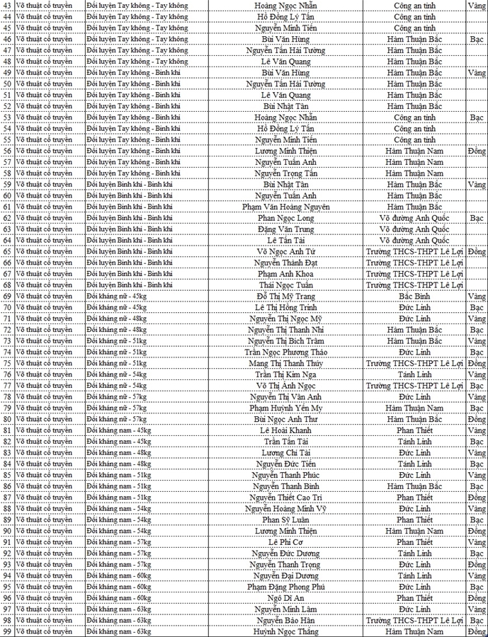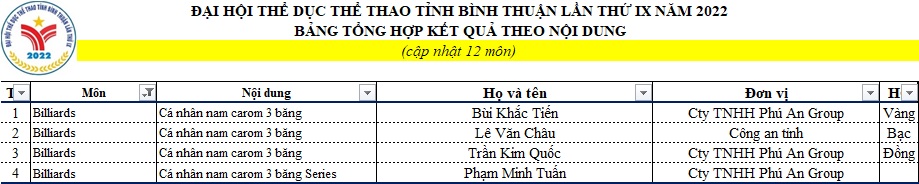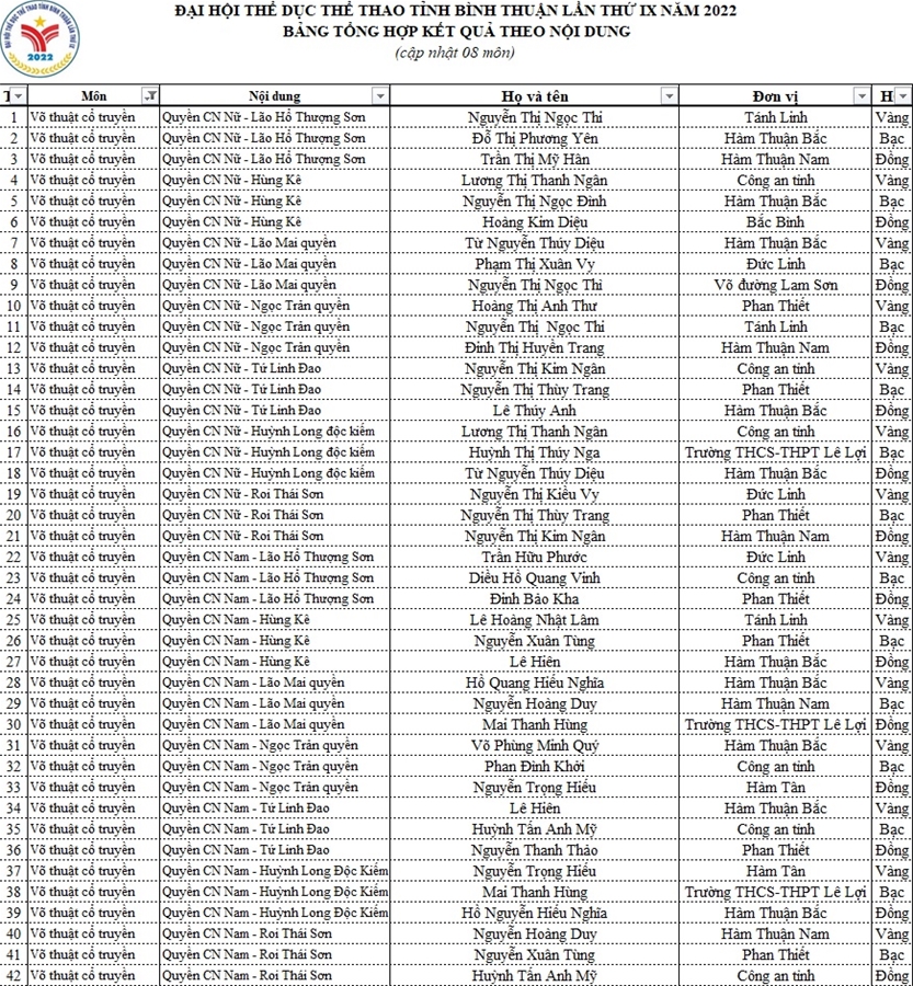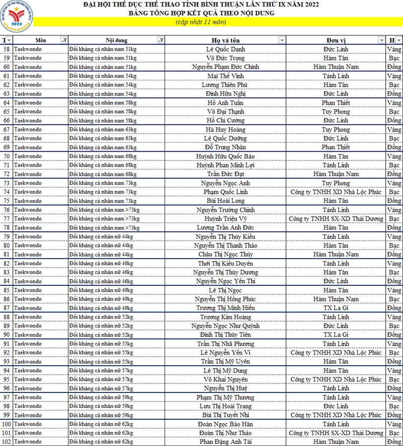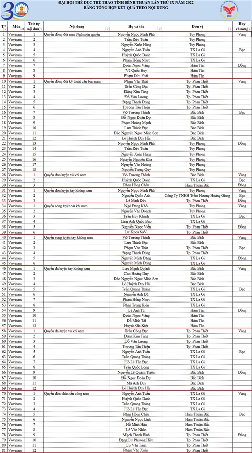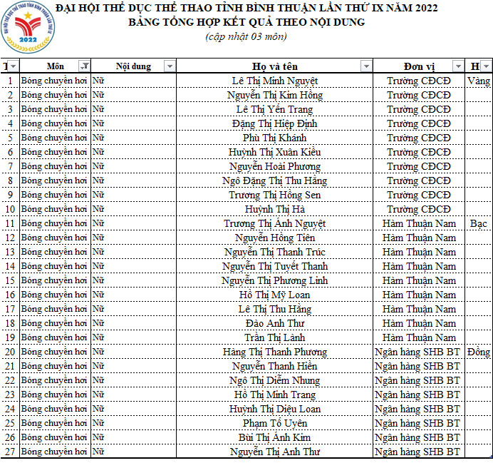 Bảng tổng sắp huy chương - nội dung các môn Đại hội TDTT tỉnh Bình Thuận lần thứ IX - 2022 cập nhật toàn bộ 16 môn: Cầu lông, Bóng chuyền hơi nữ, Việt dã, Ba môn phối hợp, Futsal, Xe đạp, Bóng chuyền bãi biển, Bóng đá bãi biển, Võ cổ truyền, Bóng chuyền nam, Taekwondo, Billiards, Golf, Vovinam, Điền kinh và Bóng đá 11 người.