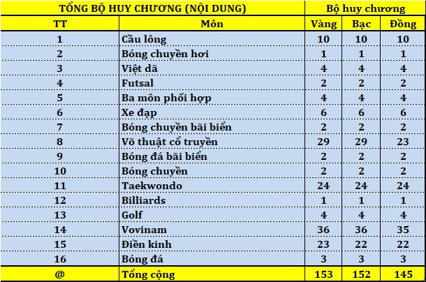BẢNG TỔNG HỢP HUY CHƯƠNG THEO NỘI DUNG