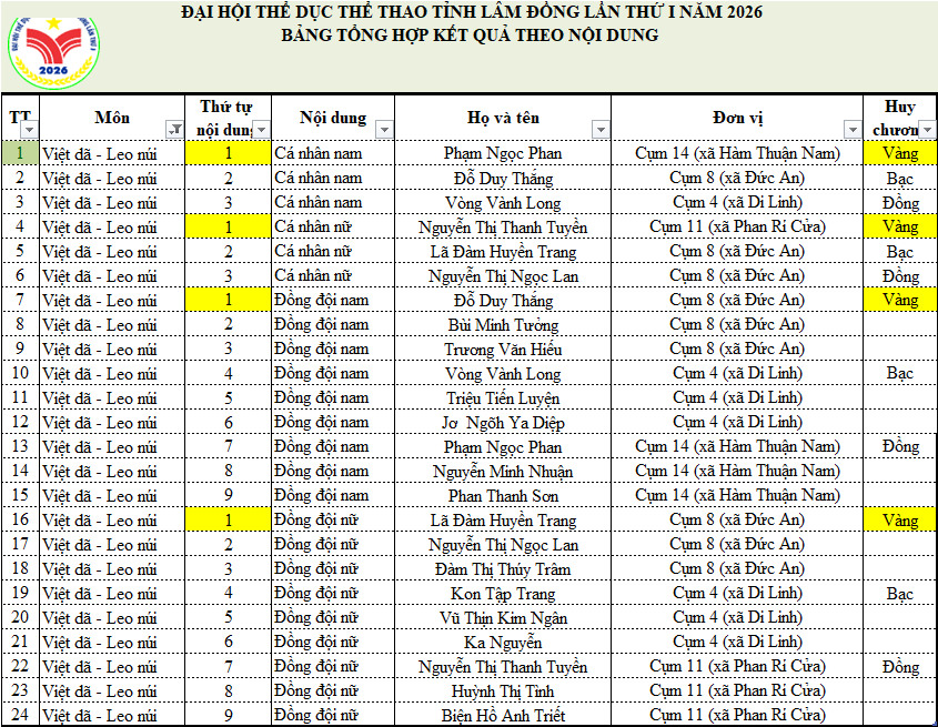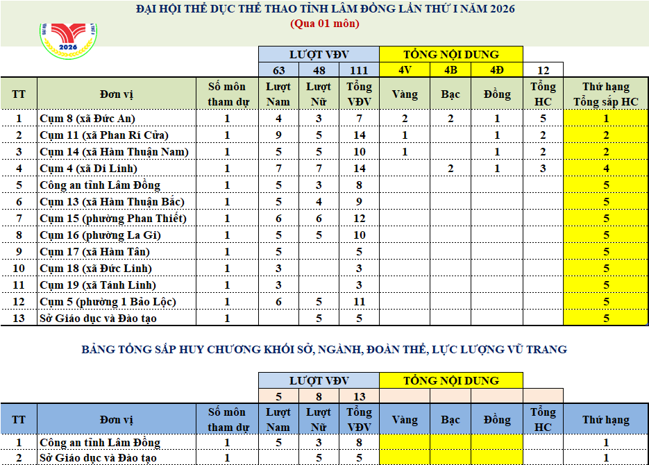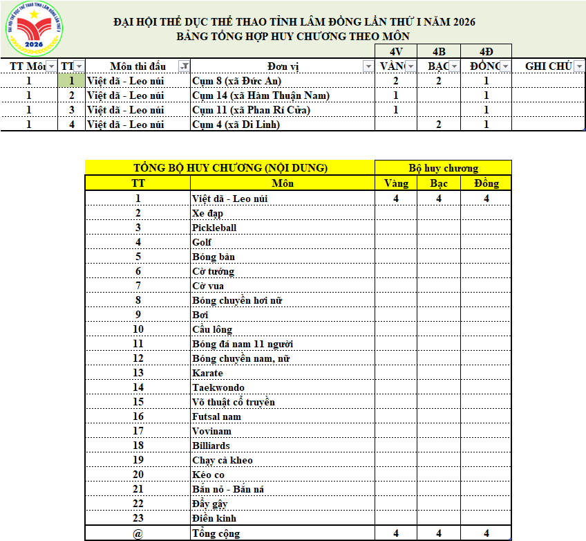 BẢNG TỔNG SẮP HUY CHƯƠNG ĐẠI HỘI THỂ DỤC THỂ THAO TỈNH LÂM ĐỒNG LẦN THỨ I NĂM 2026 (cập nhật từng môn)