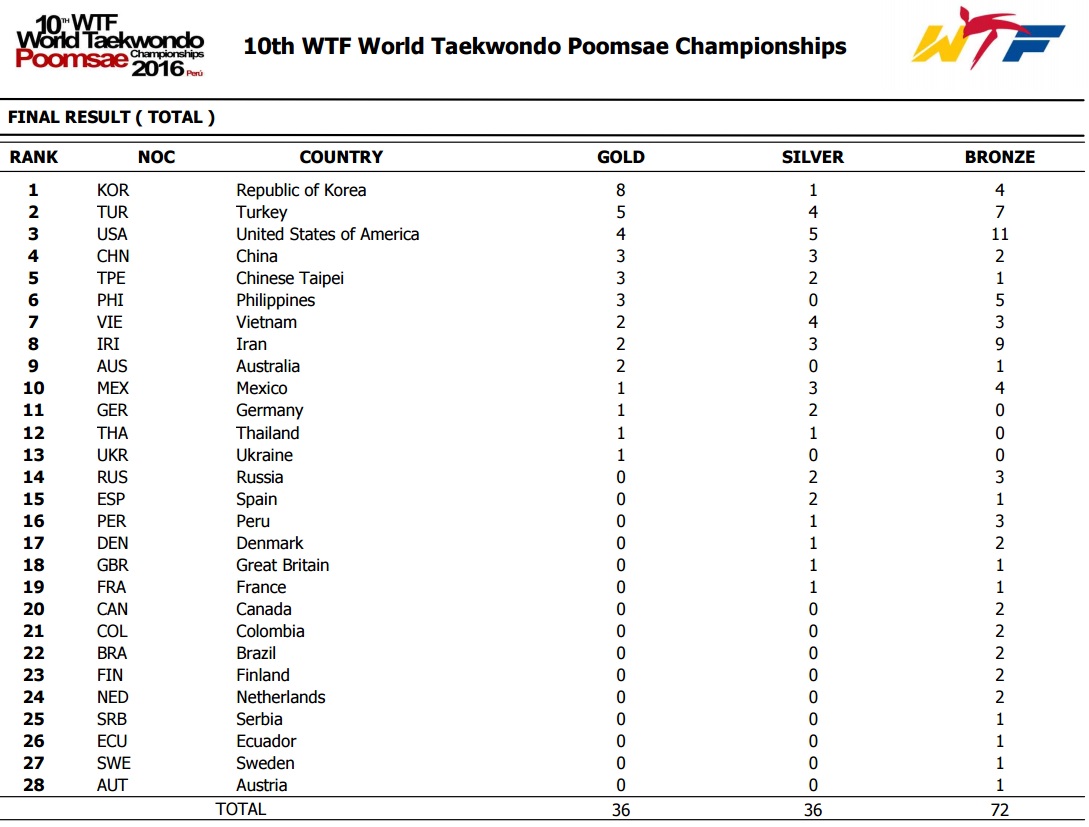 Bên cạnh đó, theo bảng xếp hạng huy chương toàn đoàn, ngoài Hàn Quốc khẳng định ngôi độc tôn thế giới (8 HCV/1 HCB/4 HCĐ), nhì là Thổ Nhĩ Kỳ (5/4/7), ba là Mỹ (4/5/11) thì có sự xuất hiện các quốc gia thuộc Đông Á: Trung Quốc hạng tư (3/3/2), hạng năm Đài Loan (3/2/1), đặc biệt có mặt Philippines thuộc Đông Nam Á xếp trên Việt Nam ở vị trí thứ 6 (3/0/5). Cho thấy, đường đến Asiad – Indonesia 2018 còn nhiều gian nan và thách thức đối với tuyển quyền Việt Nam chinh phục sân chơi Á Vận hội một khi nội dung quyền đã được đưa vào chương trình thi đấu.