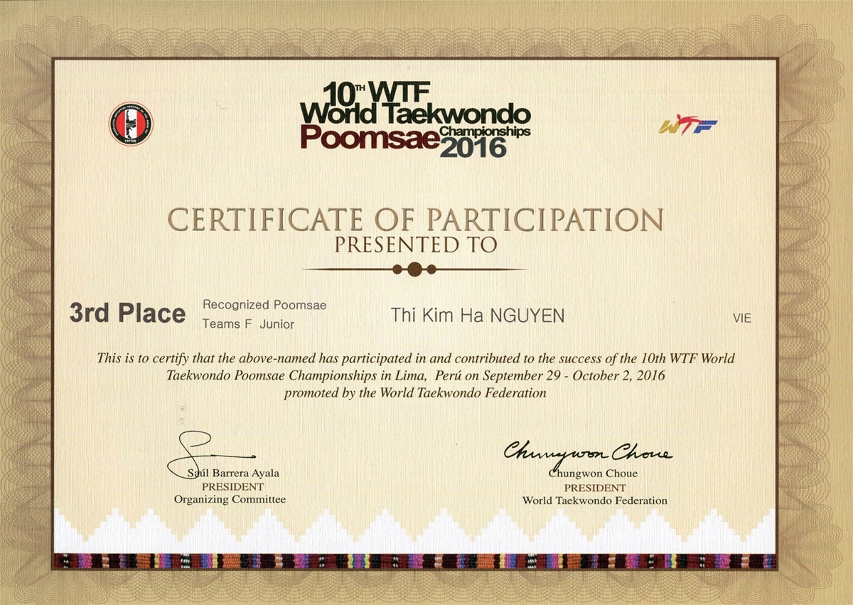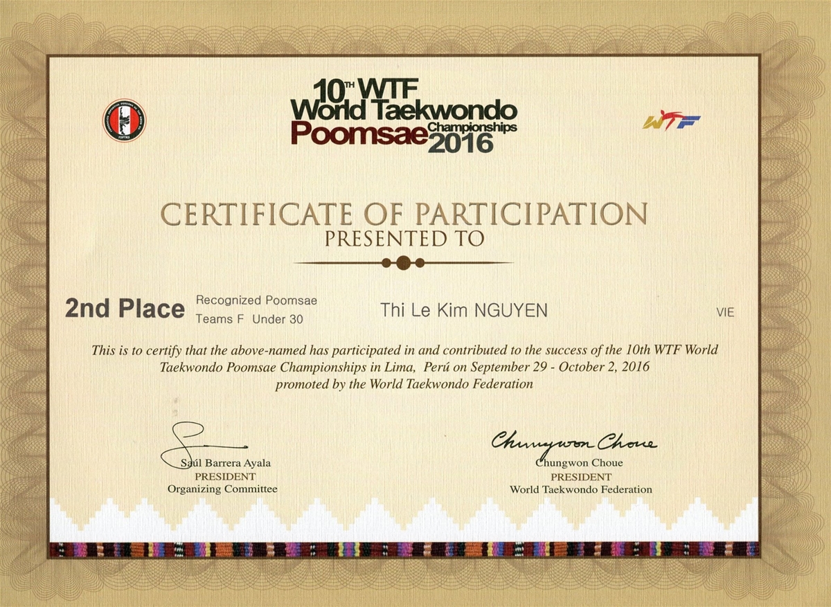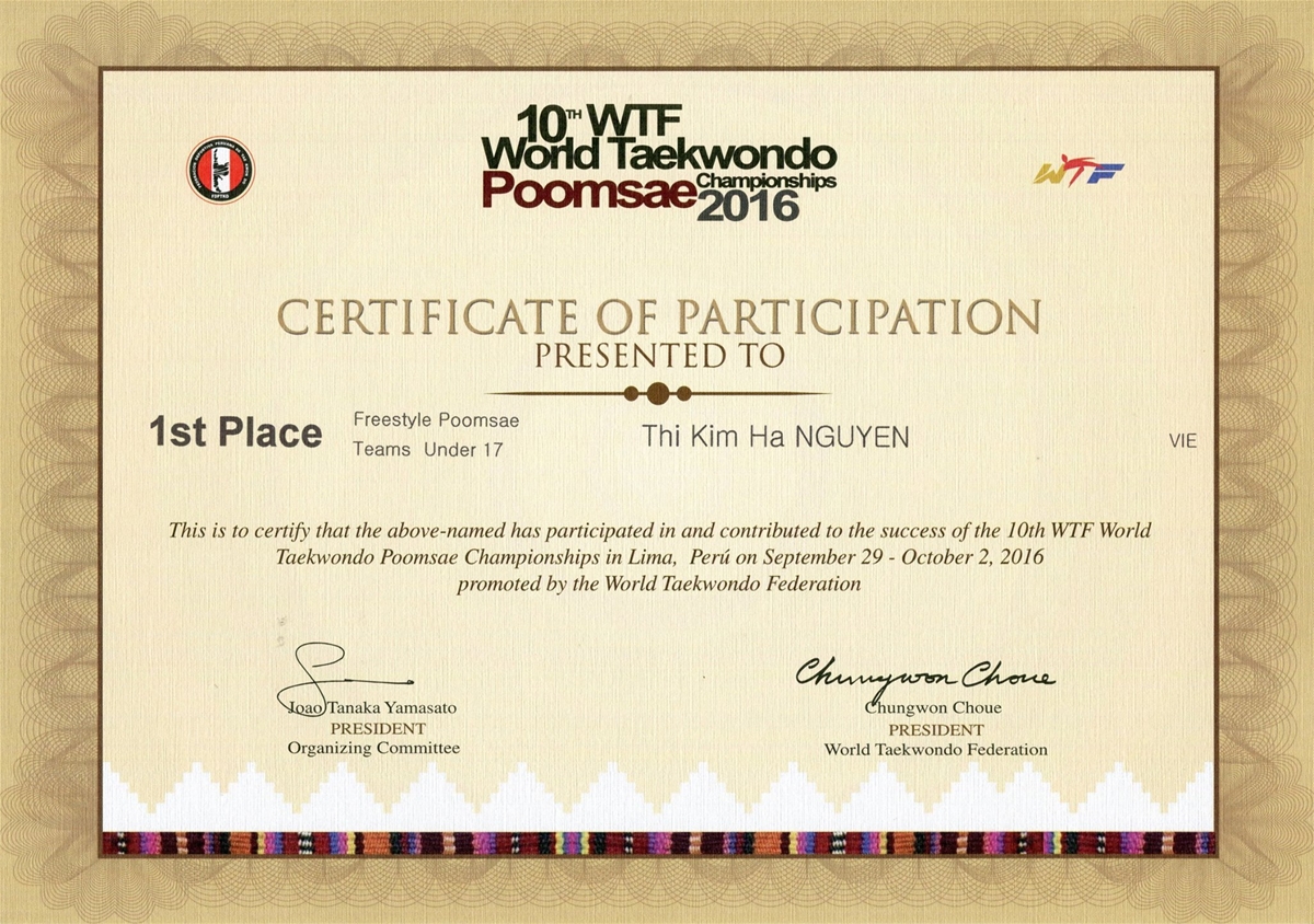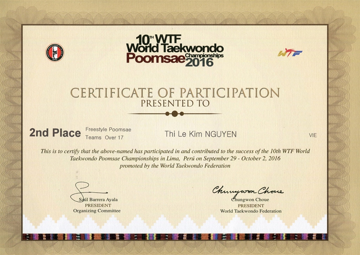 Giải vô địch quyền Taekwondo thế giới lần thứ 10 năm 2016 được tổ chức tại Lima - Peru từ ngày 29/9 đến ngày 2/10/2016. Tỉnh Bình Thuận góp mặt 02 Vận động viên vốn là chị em ruột Nguyễn Thị Lệ Kim và Nguyễn Thị Kim Hà đạt 01 HCV, 02 HCB, 01 trong tổng số 02 HCV, 04 HCB, 03 HCĐ của đoàn Việt Nam.