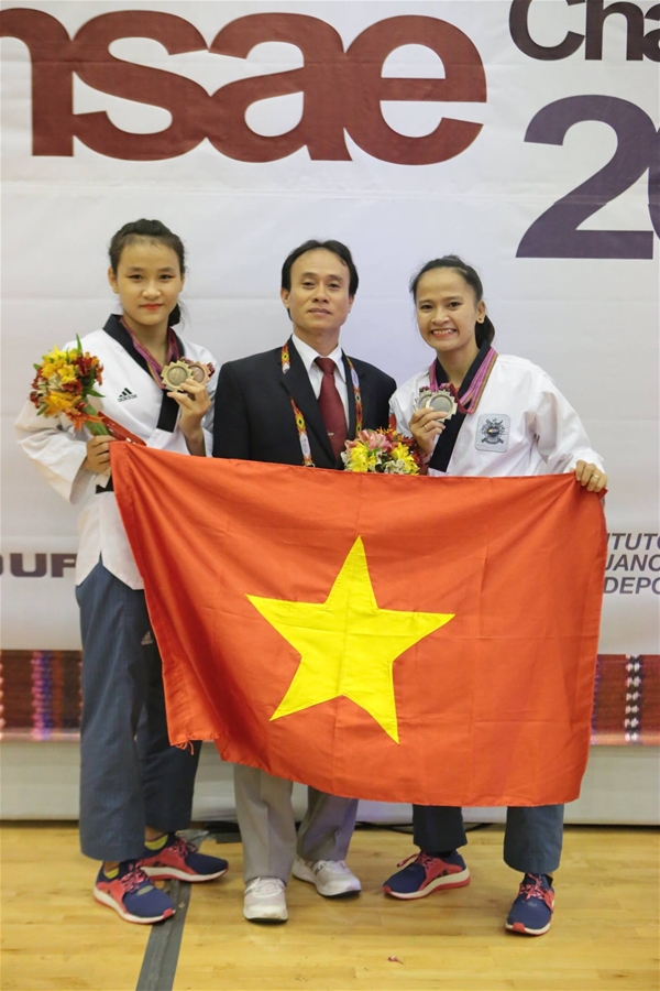 Ông Nguyễn Thanh Huy - HLV Trưởng đội tuyển quyền Taekwondo Việt Nam cùng bộ ba quyền tiêu chuẩn đồng đội nữ