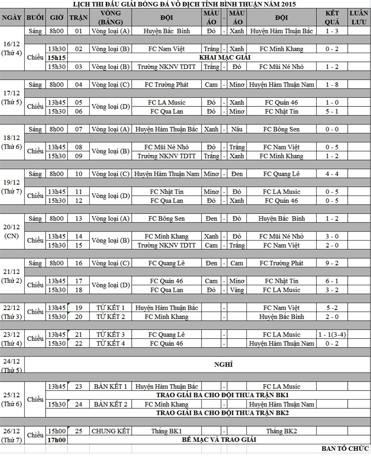 LỊCH THI ĐẤU GIẢI BÓNG ĐÁ VÔ ĐỊCH TỈNH BÌNH THUẬN NĂM 2015