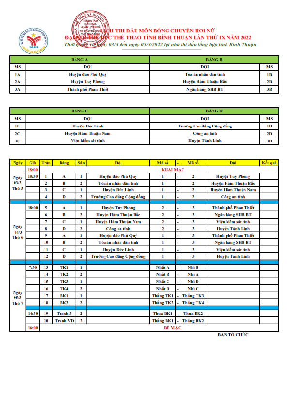 Sáng 02/3/2022 tại Trung tâm Đào tạo, Huấn luyện và Thi đấu TDTT tỉnh Bình Thuận đã diễn ra cuộc họp chuyên môn – kỹ thuật môn Bóng chuyền hơi Nữ, lần đầu tiên được đưa vào chương trình thi đấu Đại hội với sự tham dự của 12 đoàn tranh 01 bộ huy chương diễn ra từ ngày 03 – 05/3/2022 tại Nhà thi đấu tổng hợp tỉnh.
