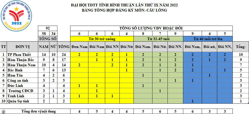 Môn Cầu lông sẽ diễn ra từ ngày 24/02 đến 26/02/2022 tại Nhà thi đấu tổng hợp tỉnh Bình Thuận. Là môn thi đầu tiên được tổ chức trong trạng thái bình thường mới với gần 100 VĐV thuộc 10 đơn vị trong tỉnh tham dự tranh 10 bộ huy chương ở 3 nhóm tuổi 30 trở xuống, 31 – 45 tuổi và 46 trở lên.