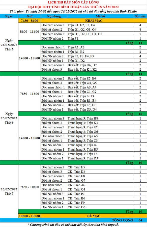 Dưới đây là chương trình thi đấu môn Cầu lông