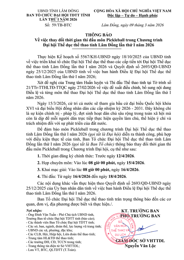 Nhằm đảm bảo công tác tổ chức diễn ra thuận lợi và phù hợp với tình hình thực tế, Ban Tổ chức Đại hội Thể dục Thể thao tỉnh Lâm Đồng lần thứ I năm 2026 trân trọng thông báo thay đổi thời gian thi đấu môn Pickleball trong chương trình Đại hội.