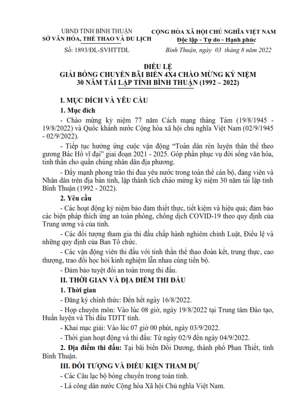 Chào mừng kỷ niệm 77 năm Cách mạng Tháng Tám (19/8/1945 - 19/8/2022), Quốc khánh nước Cộng hòa xã hội chủ nghĩa Việt Nam (2/9/1945 - 2/9/2022) và kỷ niệm 30 năm tái lập tỉnh Bình Thuận (1992 – 2022). Sở VHTTDL Bình Thuận ban hành Điều lệ Bóng chuyền bãi biển 4x4 thi đấu từ ngày 03 - 04/9/2022 tại bãi biển Đồi Dương, Tp. Phan Thiết.