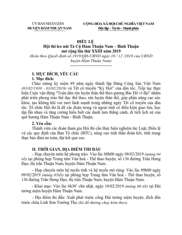 ĐIỀU LỆ Hội thi leo núi Tà Cú Hàm Thuận Nam – Bình Thuận mở rộng lần thứ 23 năm 2019