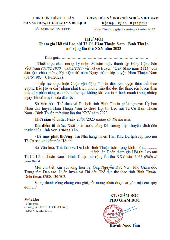 Sở Văn hóa, Thể thao và Du lịch tỉnh Bình Thuận phối hợp với UBND huyện Hàm Thuận Nam tổ chức Hội thi Leo núi Tà Cú Hàm Thuận Nam - Bình Thuận mở rộng lần thứ XXV năm 2023 vào ngày 28/01/2023 (mùng 07 Tết âm lịch) tại Khu Du lịch cáp treo Tà Cú.
