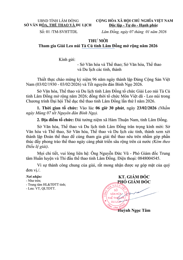 Thực hiện Kế hoạch của Ủy ban nhân dân tỉnh Lâm Đồng về việc tổ chức Đại hội Thể dục Thể thao các cấp tiến tới Đại hội Thể dục Thể thao tỉnh Lâm Đồng lần thứ I năm 2026; thiết thực chào mừng các ngày lễ lớn của đất nước, kỷ niệm 96 năm Ngày thành lập Đảng Cộng sản Việt Nam (03/02/1930 – 03/02/2026) và Tết Nguyên đán Bính Ngọ 2026, Sở Văn hóa, Thể thao và Du lịch tỉnh Lâm Đồng phối hợp với UBND xã Hàm Thuận Nam, UBNX xã Tân Thành tổ chức Giải Leo núi Tà Cú tỉnh Lâm Đồng mở rộng năm 2026.