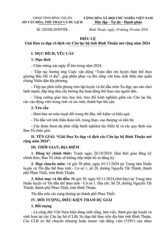 Sở Văn hóa, Thể thao và Du lịch Bình Thuận phối hợp với Liên đoàn Xe đạp thể thao Bình Thuận tổ chức Giải Đua xe đạp vô địch các Câu lạc bộ tỉnh Bình Thuận mở rộng năm 2024 vào sáng ngày 02/11/2024 tại các cung đường thành phố Phan Thiết.
