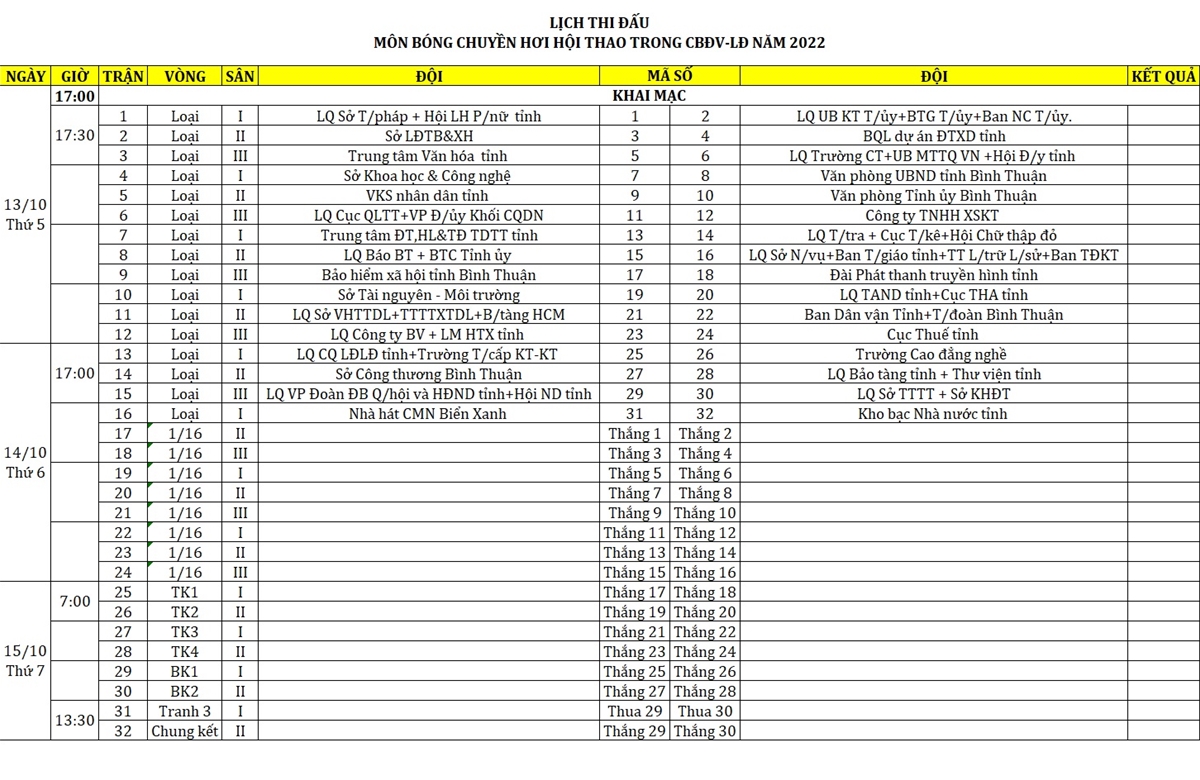 Chào mừng Đại hội Công đoàn các cấp tiến tới đại biểu Công đoàn tỉnh Bình Thuận lần thứ XI, nhiệm kỳ 2023 – 2028 và đẩy mạnh phong trào tập luyện TDTT, thi đua sôi nổi trong lực lượng cán bộ đoàn viên – lao động ở khối các cơ quan, Sở, ban, ngành, đoàn thể cấp tỉnh. Công đoàn viên chức tỉnh tổ chức Hội thao trong cán bộ, đoàn viên – lao động năm 2022 với 32 đoàn gần 1000 VĐV là Công đoàn viên cơ sở trực thuộc Công đoàn viên chức tỉnh tham dự ở 03 môn Bóng chuyền hơi nam-nữ, Kéo co và Nhảy bao bố từ ngày chiều tối 13/10 - 15/10/2022 tại Nhà thi đấu tổng hợp tỉnh.