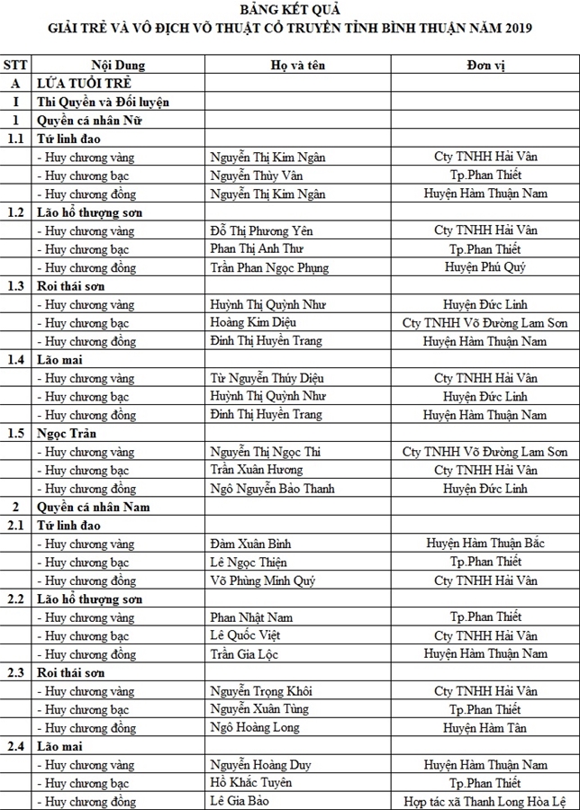Tham dự giải có 153 VĐV (60 nữ) thuộc 10 đơn vị: Huyện Đức Linh, Công ty TNHH Võ đường Lam Sơn, huyện Hàm Thuận Bắc, Công ty TNHH Hải Vân, Tp. Phan Thiết, huyện Phú Quý, huyện Hàm Thuận Nam, huyện Tánh Linh, huyện Hàm Tân và Hợp tác xã Thanh Long Hòa Lệ, cùng nhau tranh tài giành 36 bộ huy chương (23 bộ quyền và 13 bộ đối kháng) ở 2 nhóm tuổi trẻ và vô địch.