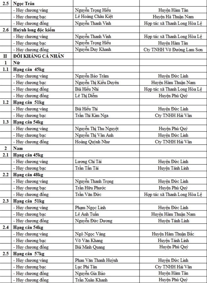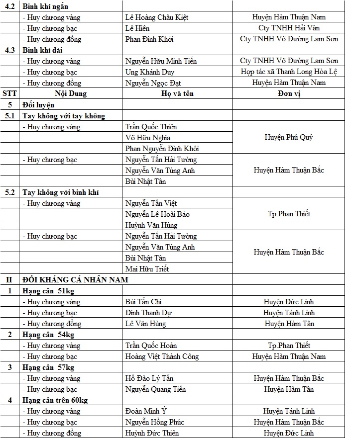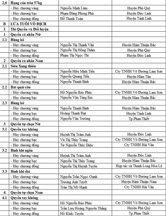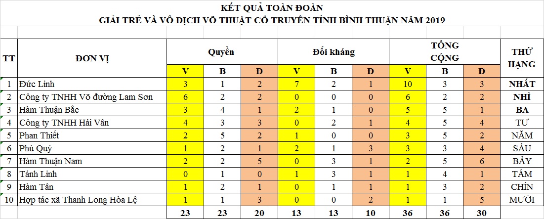 Kết quả chung cuộc, huyện Đức Linh đạt Nhất toàn đoàn (10 HCV, 03 HCB, 03 HCĐ), Công ty TNHH Võ đường Lam Sơn hạng Nhì toàn đoàn (06 HCV, 02 HCB, 02 HCĐ) và ba toàn đoàn là huyện Hàm Thuận Bắc (05 HCV, 05 HCB, 01 HCĐ.