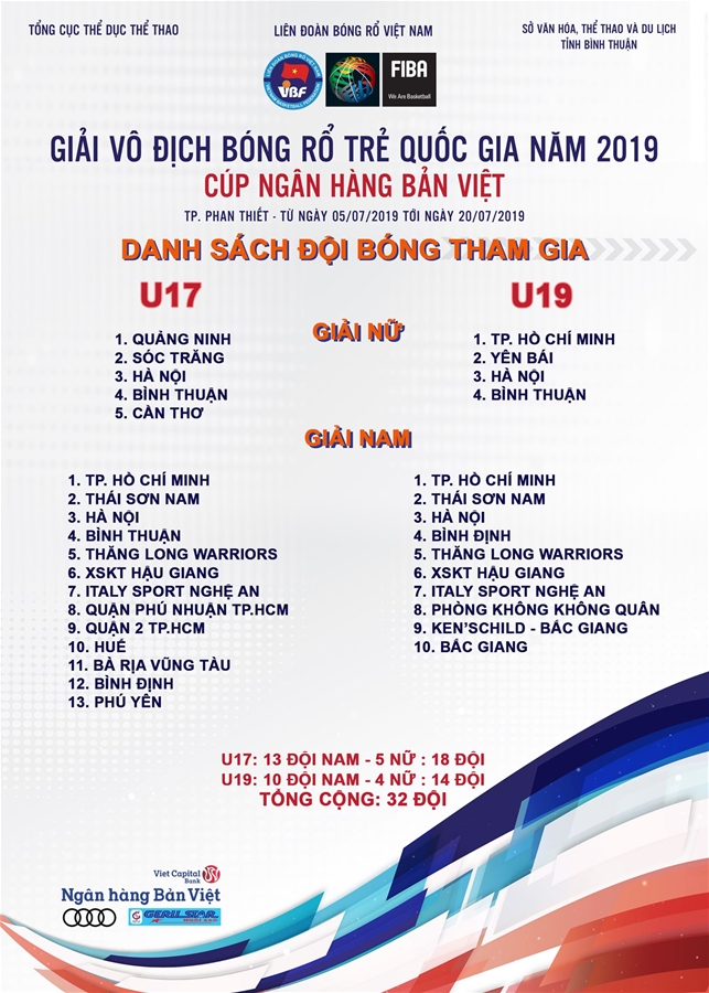 Bình Thuận đăng đai tổ chức Giải vô địch Bóng rổ trẻ quốc gia – Bình Thuận năm 2019 - Cúp Ngân hàng Bản Việt từ ngày 05/7 đến 20/7/2019 tại Nhà thi đấu tỉnh Bình Thuận do Sở Văn hóa, Thể thao và Du lịch Bình Thuận phối hợp với Liên đoàn Bóng rổ Việt Nam tổ chức.