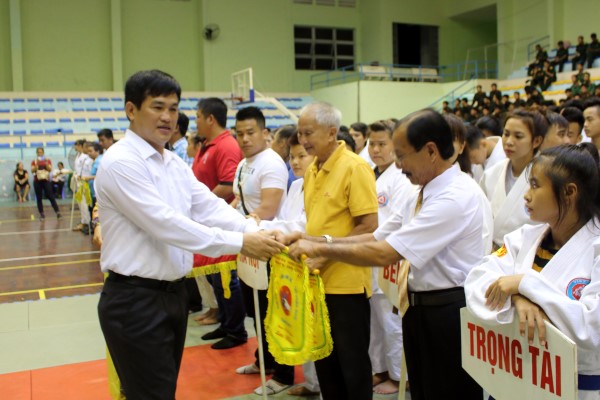 Ông Nguyễn Đức Hòa - Phó Chủ tịch UBND tỉnh Bình Thuận trao Cờ lưu niệm và hoa động viên tinh thần các đội thi đấu.
