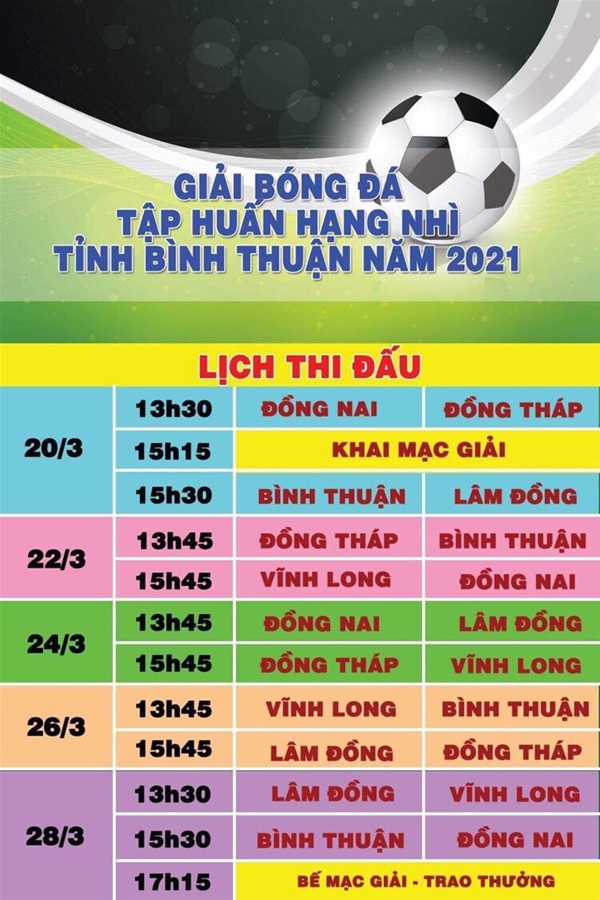 Cũng trong chiều 20/3 đã diễn ra 2 trận đấu đầu tiên của giải là Đồng Nai gặp Đồng Tháp và chủ nhà Bình Thuận gặp Lâm Đồng và đều kết thúc với tỷ số hòa 1 - 1. Theo kế hoạch, giải sẽ liên tục diễn ra vào các buổi chiều cách ngày cho đến ngày 28/3. Lễ bế mạc và trao giải thưởng diễn ra vào chiều cùng ngày trên Sân vận động Phan Thiết.
