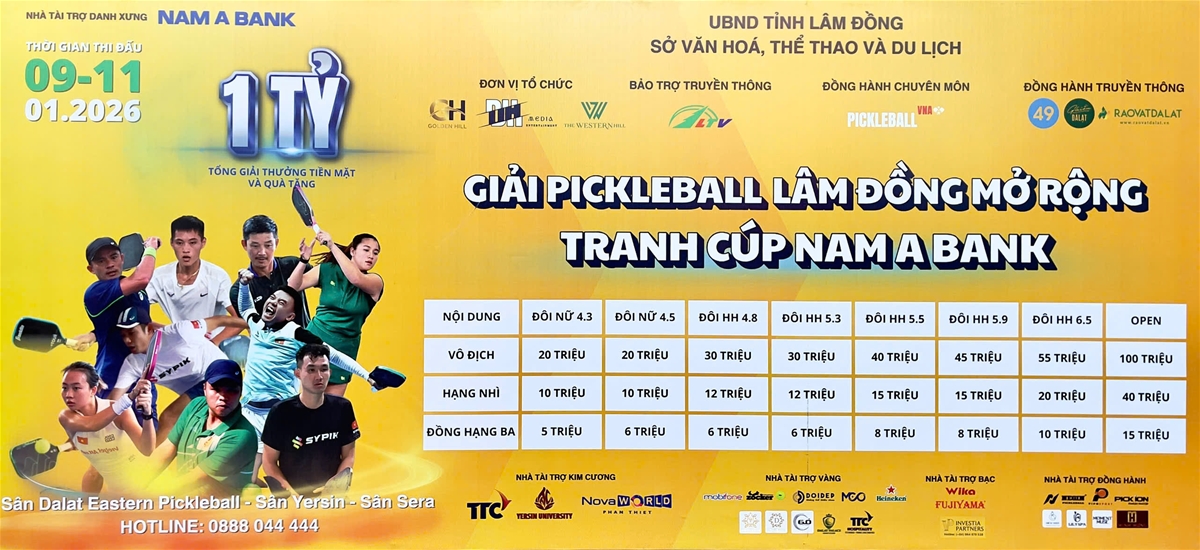 Sáng ngày 09/1/2026, tại Nhà thi đấu tỉnh Lâm Đồng, Sở Văn hóa, Thể thao và Du lịch tỉnh Lâm Đồng long trọng tổ chức Lễ khai mạc Giải Pickleball tỉnh Lâm Đồng mở rộng tranh Cúp Nam Á Bank. Giải đấu diễn ra từ ngày 09 đến 11/1/2026 tại 3 cụm sân tại thành phố ngàn hoa - Đà Lạt, tỉnh Lâm Đồng gồm: Dalat Eastern Pickleball, sân Sera và sân Yersin.