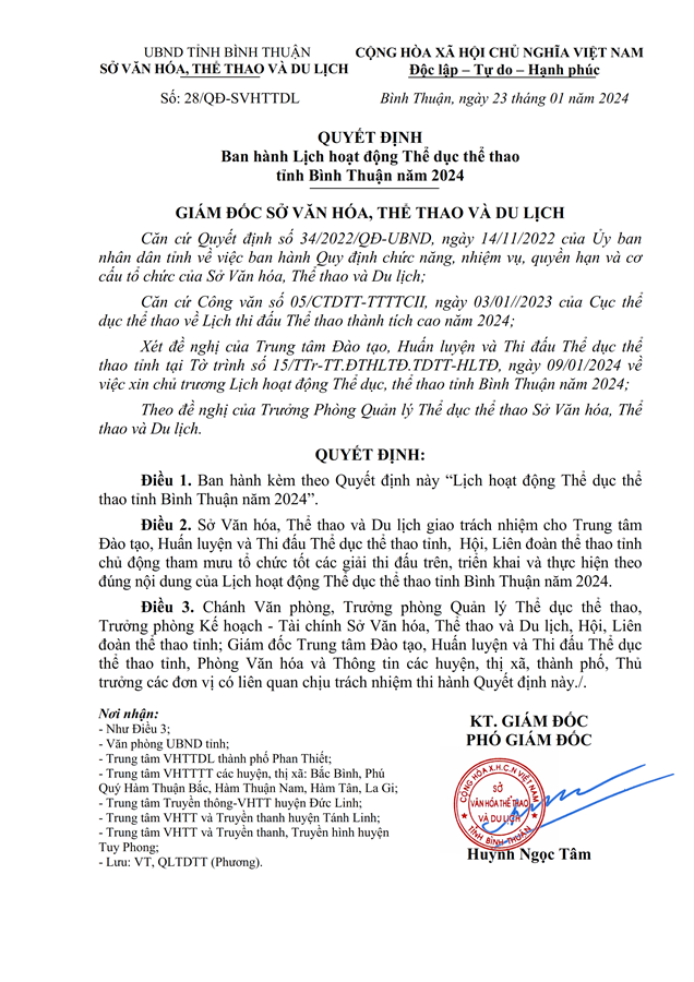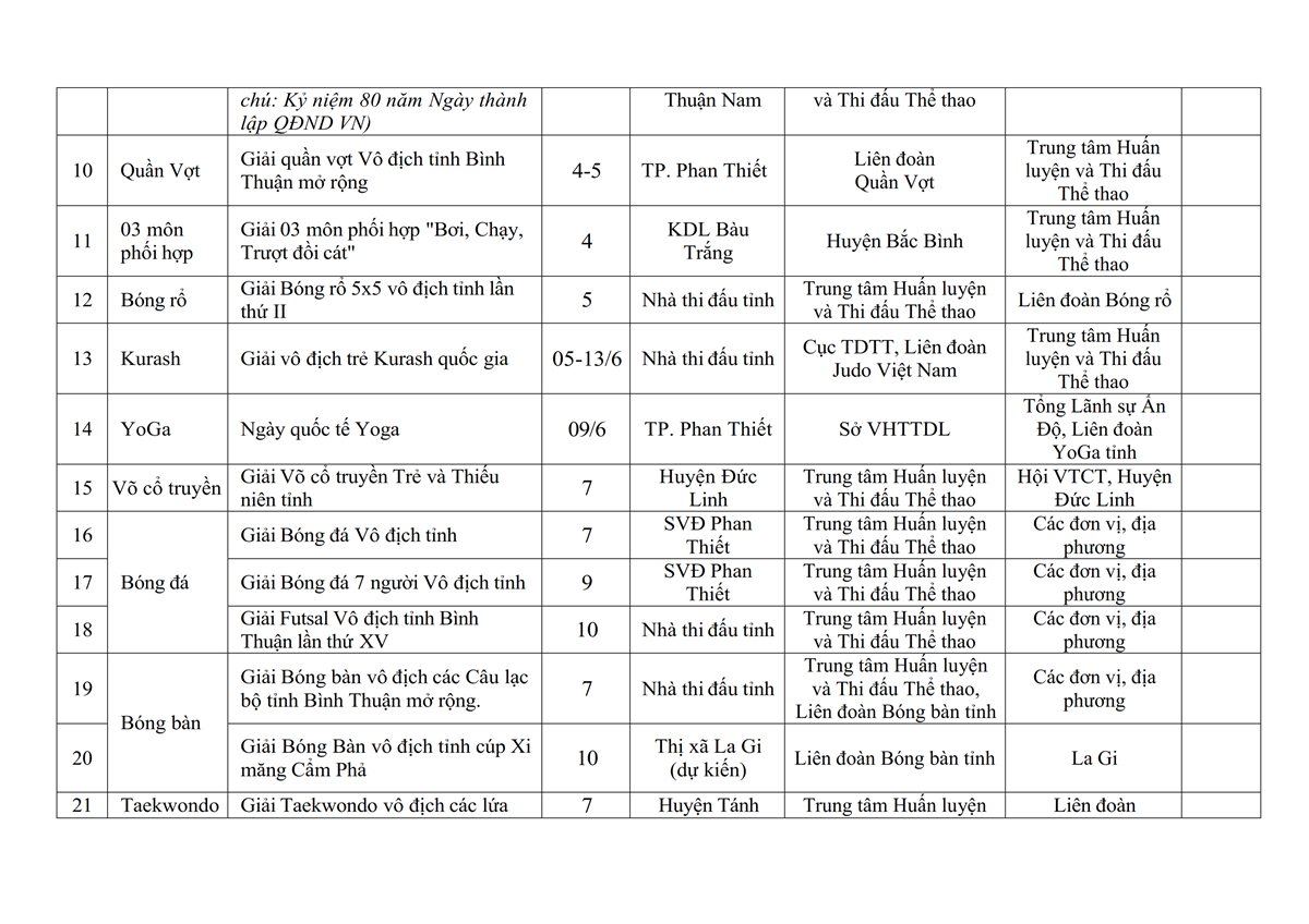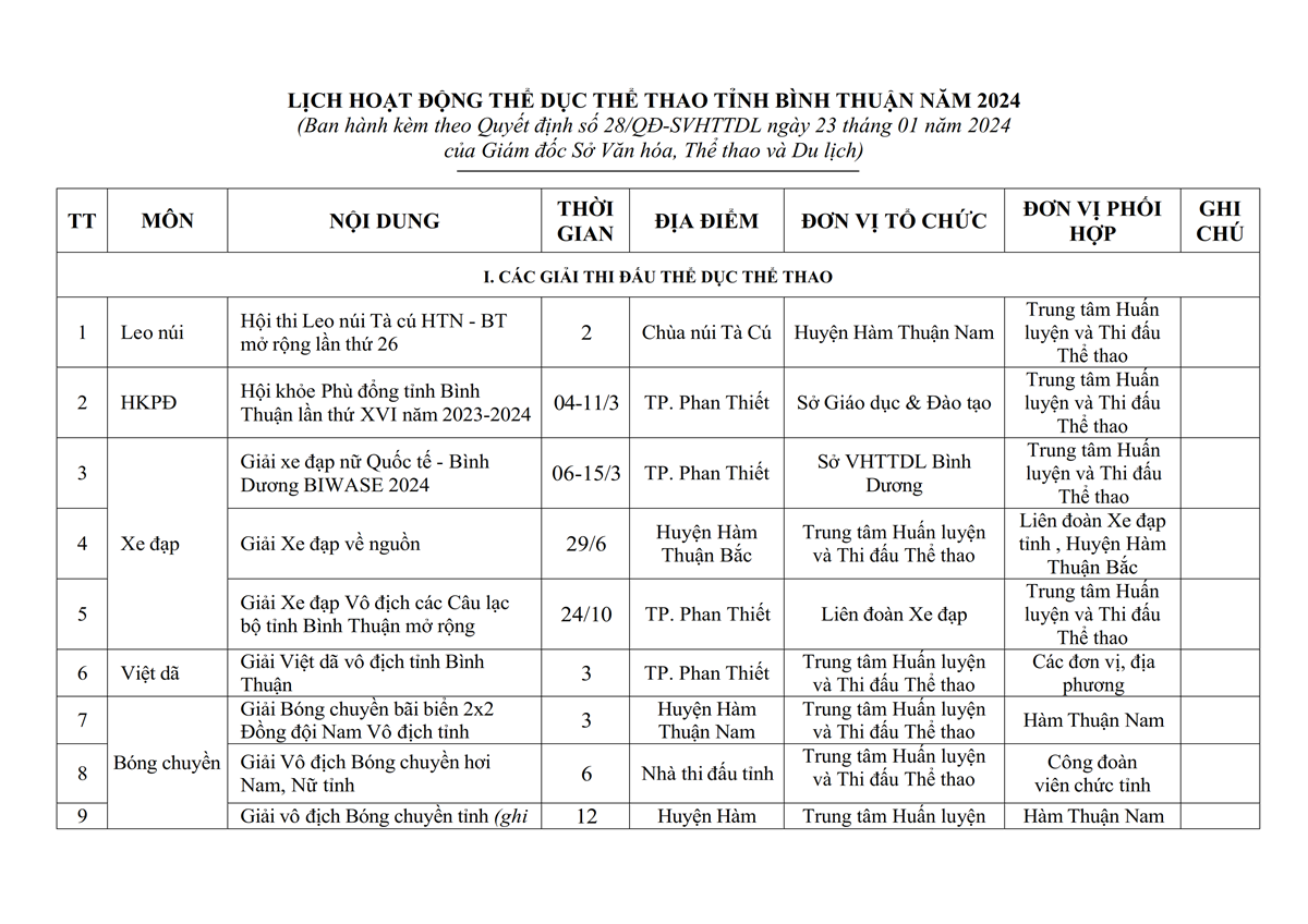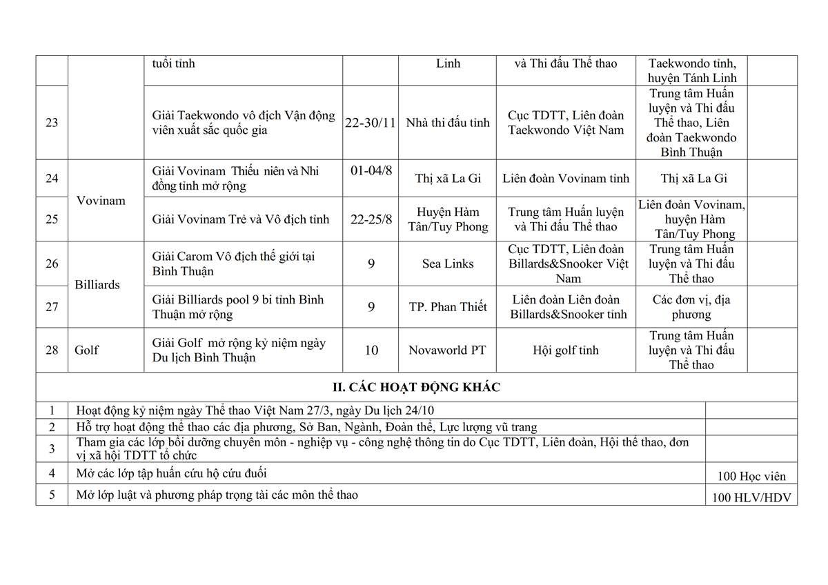 Năm 2024, Thể thao Bình Thuận tổ chức và phối hợp tổ chức 28 giải thể thao chính thức. Trong đó, giải Giải Carom Vô địch thế giới được vinh dự đăng cai tổ chức tại Bình Thuận vào cuối tháng 9 năm 2024.