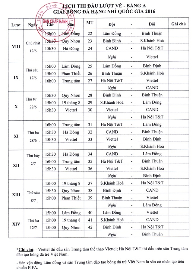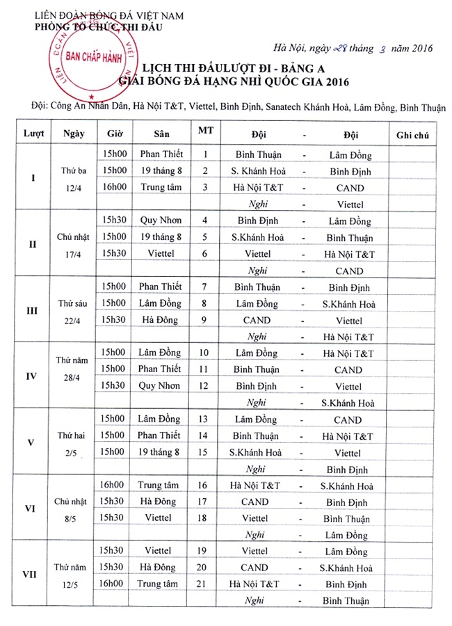- 01 (một) Đội Hạng Nhất năm 2015 xuống thi đấu ở Hạng Nhì Quốc Gia 2016: Công An Nhân Dân.