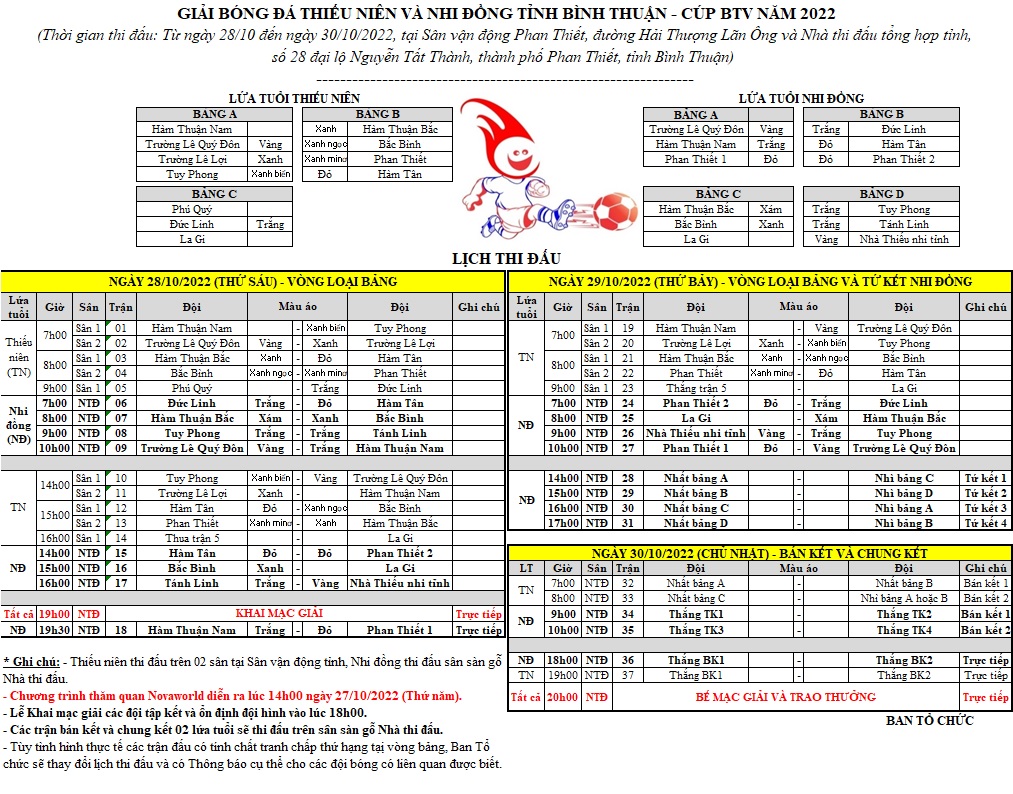 Qua hai năm gián đoạn (2020, 2021), Từ ngày 28 – 30/10/2022, tại Sân Vận động Phan Thiết và Nhà thi đấu tỉnh, giải đấu sẽ chính thức khởi tranh với 23 đội bóng (11 đội Thiếu niên và 12 đội Nhi đồng) là các cầu thủ “nhí” học sinh Tiểu học, Trung học cơ sở thuộc 10 huyện, thị, thành phố, 03 đơn vị Trường TH, THCS và THPT Lê Quý Đôn, Trường THCS & THPT Lê Lợi, Nhà Văn hóa Thiếu nhi tỉnh (Tp. Phan Thiết).