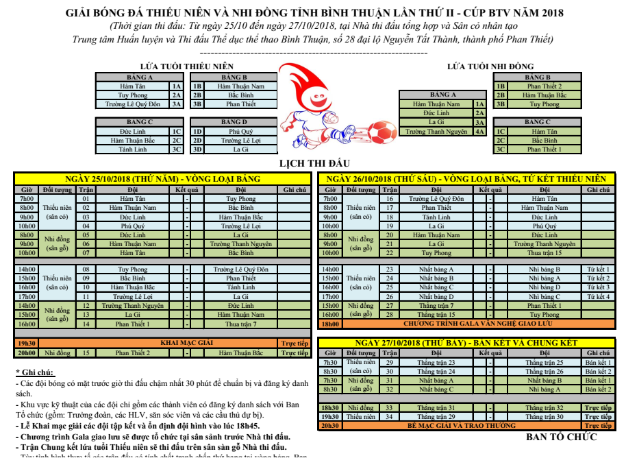 Lịch thi đấu Giải Bóng đá Thiếu niên và Nhi đồng tỉnh Bình Thuận lần thứ II – Cúp BTV 2018