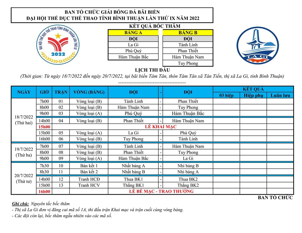 Lịch thi đấu môn Bóng đá bãi biển Đại hội TDTT tỉnh Bình Thuận lần thứ IX năm 2022