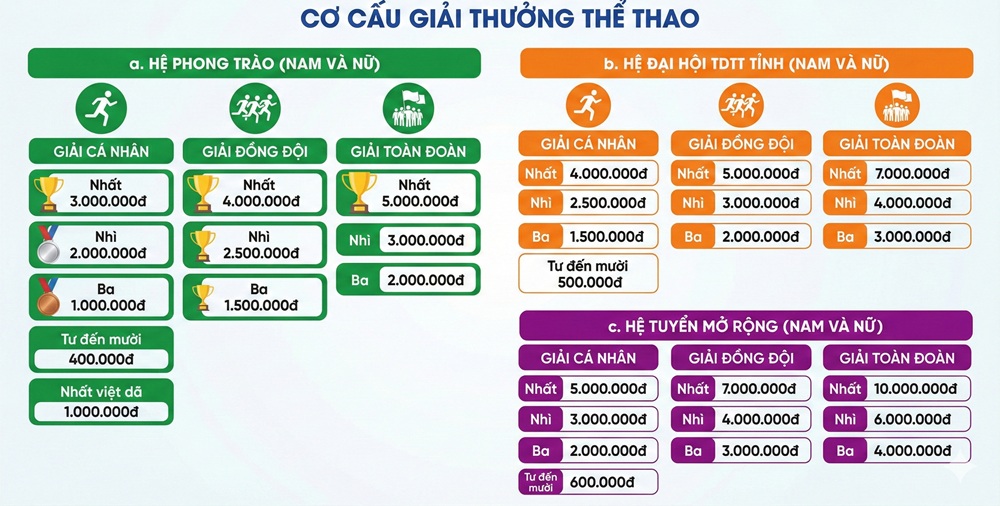 Ban Tổ chức trao giải cá nhân, giải đồng đội và giải toàn đoàn cho các nội dung thi đấu theo từng hệ, với cơ cấu giải thưởng bằng tiền mặt, cúp, cờ và giấy chứng nhận theo đúng quy định tại Điều lệ Giải.