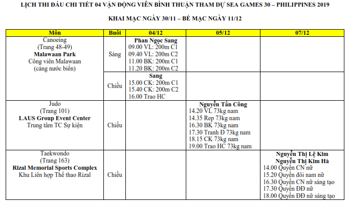 Trong danh sách Đoàn Thể thao Việt Nam tham dự SEA Games 30 (diễn ra từ ngày 20-11 đến 12-12 tại Philippines), tỉnh Bình Thuận đóng góp 04 VĐV gồm: VĐV Nguyễn Thị Lệ Kim, Nguyễn Thị Kim Hà môn Taekwondo; VĐV Nguyễn Tấn Công môn Judo và VĐV Phan Ngọc Sang môn Canoeing.