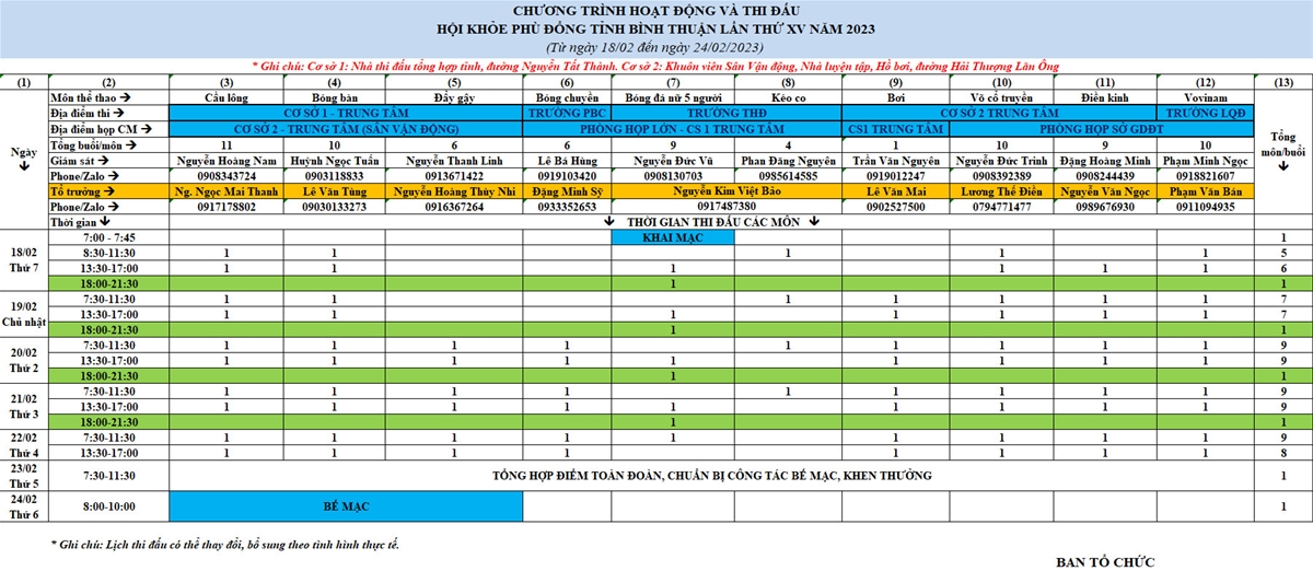 ⦁ Bế mạc: Lúc 08 giờ 00 ngày 24/02/2023 tại Trung tâm Đào tạo và Huấn luyện thi đấu TDTT (ĐTHL và TĐ TDTT) tỉnh (đường Nguyễn Tất Thành).