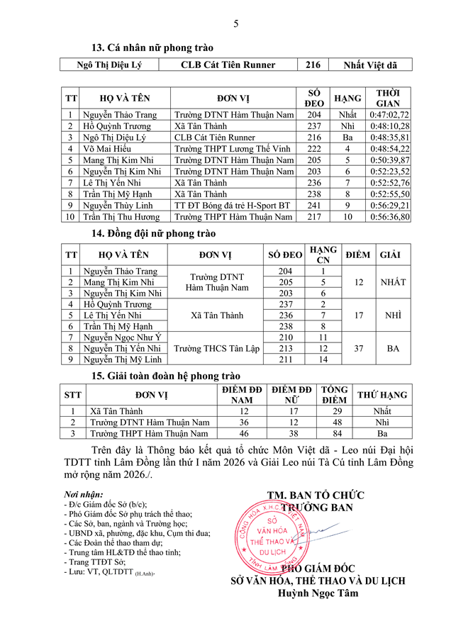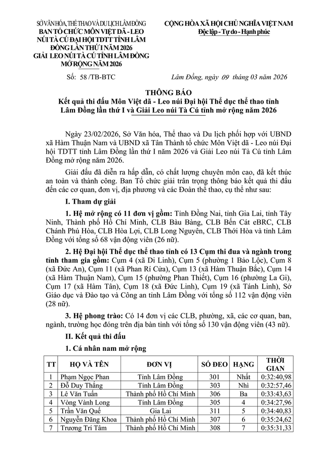 Ngày 23/02/2026, Sở Văn hóa, Thể thao và Du lịch phối hợp với UBND xã Hàm Thuận Nam và UBND xã Tân Thành tổ chức Môn Việt dã - Leo núi Đại hội TDTT tỉnh Lâm Đồng lần thứ I năm 2026 và Giải Leo núi Tà Cú tỉnh Lâm Đồng mở rộng năm 2026.