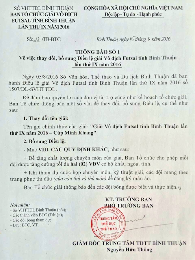 Thông báo số 1 giải Vô địch Futsal tỉnh Bình Thuận lần thứ IX năm 2016.