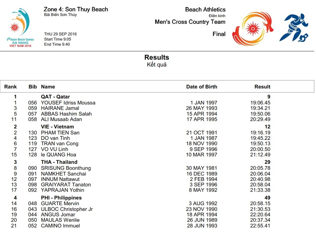 Sáng ngày 29/09/2016, tại bãi biển Sơn Thủy, Quận Ngũ Hành Sơn, Tp. Đà Nẵng diễn ra nội dung chạy việt dã trên cát 6km ở môn Điền kinh trong chương trình thi đấu Asian Beach Games 5 – Đà Nẵng, Việt Nam 2016. Việt Nam xuất sắc đạt Huy chương Bạc đồng đội với tổng thứ hạng 12 điểm, tuyển Qatar giành Huy chương vàng với 9 điểm.