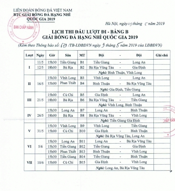 1. Do đội Bóng Bến tre không tham dự giải Bóng đá hạng Nhì Quốc gia - Cúp Asanzo 2019, để đảm bảo công tác tổ chức giải và quá trình chuẩn bị của các đội bóng tại Bảng B, BTC giải quyết định.