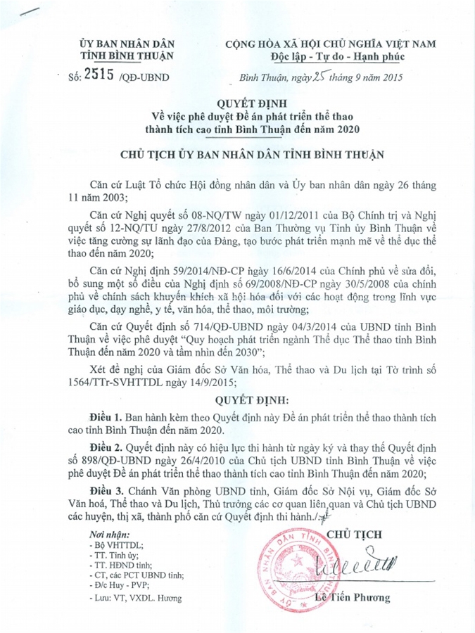 Quyết định 2515/QĐ-UBND ngày 25/9/2015 về việc phê duyệt Đề án phát triển thể thao thành tích cao tỉnh Bình Thuận đến năm 2020.